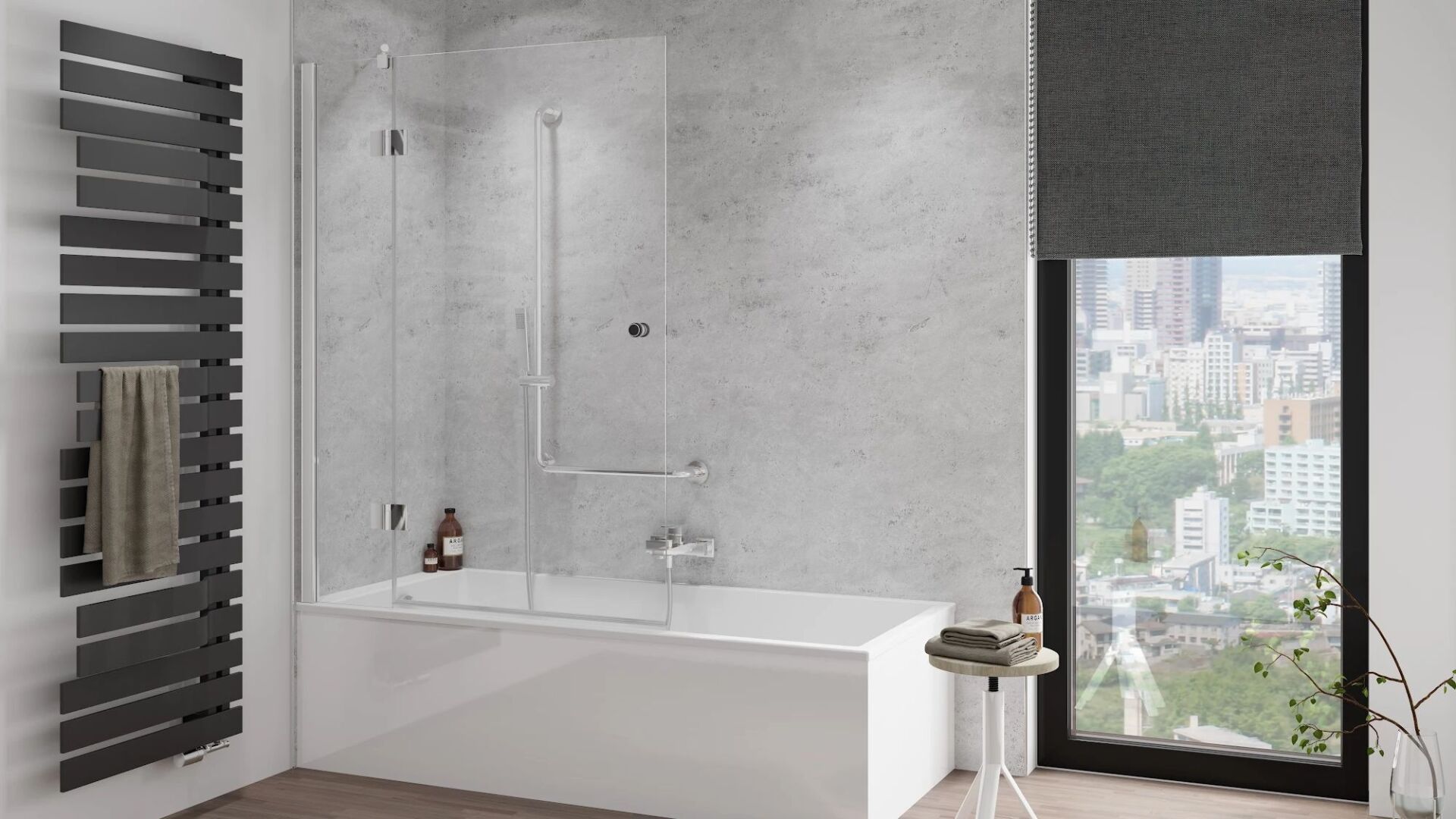 Exklusiv 2.0 Badewannenaufsatz pendelbar, Drehfalttür 3-teilig. Glasoption Echtglas Grau