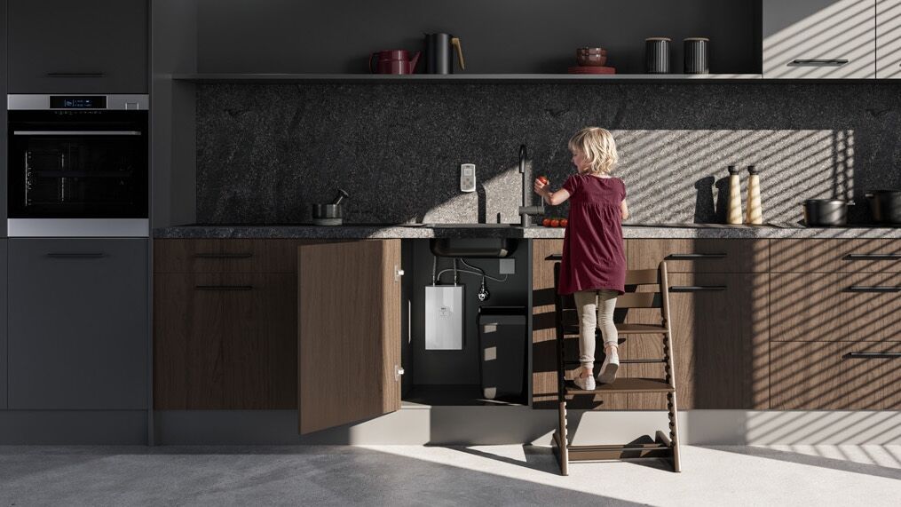 Elektronisch geregelter Kompakt Durchlauferhitzer zum platzsparenden Einbau unter der Küchenspüle oder für mehr Komfort unter dem Waschtisch und Handwaschbecken. Weitgehend konstante Auslauftemperaturen bei Druck- und Zulauftemperaturschwankungen, Untertischmontage.