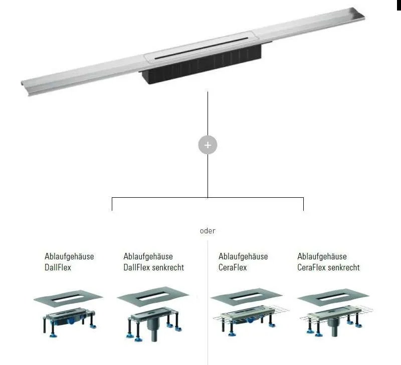 Im Baukastensystem oder als Komplettablauf, z. B. Badablauf DallDrain Plan mit minimaler Aufbauhöhe. Mit flexibler, einklickbarer Dichtmanschette zum sicheren Anschluss an Verbund- und Bahnenabdichtungen gemäß DIN 18534.