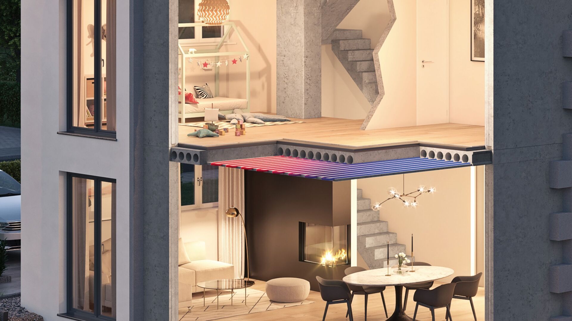 Durch ein flächendeckend eingegossenes Rohrleitungssystem, in dem warmes oder kaltes Wasser zirkuliert, wird die DX-Fertigdecke zu einer hocheffizienten und behaglichen Klimaanlage.