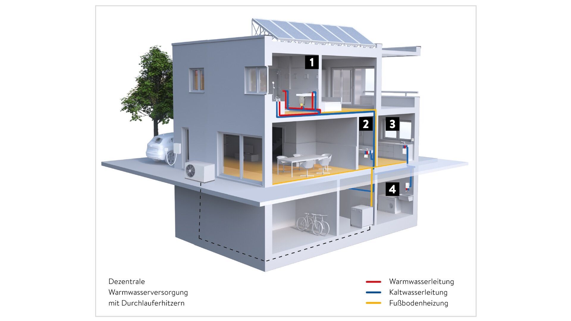 Bei Neubauten ist es sinnvoll, die Erwärmung des Wassers komplett von der Heizung zu trennen. Dabei werden Investitionskosten gespart, denn es müssen keine langen Warmwasserleitungen vom Keller ins Obergeschoss verlegt und gedämmt werden. E-Durchlauferhitzer (Im Schaubild Nummer 1 bis 4) erhitzen das Wasser bedarfsgerecht direkt am Verbrauchsort.