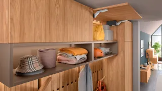 Klappensysteme sind besonders in der Küche praktische Lösungen für den Ober- oder Hochschrank. Sie unterstützen bei alltäglichen Tätigkeiten und sorgen für ungehinderten Zugriff, da sie sich nach oben aus dem Bewegungsbereich des Nutzers bewegen. Offene Türen, die in den Raum stehen und so für Verletzungsgefahr sorgen, gehören mit AVENTOS top Klappenbeschlägen der Vergangenheit an.