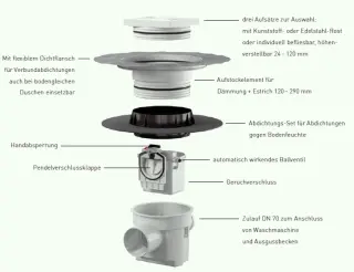 Duschrinnen Rückstauverschlüsse Duschflächen Duschabläufe Kellerabläufe Bodenabläufe Dachabläufe Kunststoff-Abläufe Barrierefreie Duschen Rohrbelüfter Brandschutz Sanitärablaufarmaturen Geräteanschlussarmaturen Rohrformstücke Parkdeckabläufe Punkt-Entwässerung Abläufe Ablaufgarnituren Urinalspülungen Entwässerung Ablauftechnik Duschräume Sanitärräume Entwässerungsanlagen BadezimmerAblaufstellen unterhalb der Rückstauebene sind laut Norm vor rückstauendem Abwasser, welches z. B. durch starke Regenfälle oder Verstopfungen entstehen kann, zu schützen. Wirkungsvollen Schutz bieten hier die Produkte der Modellreihe Stausafe